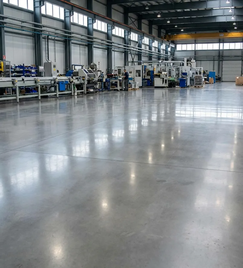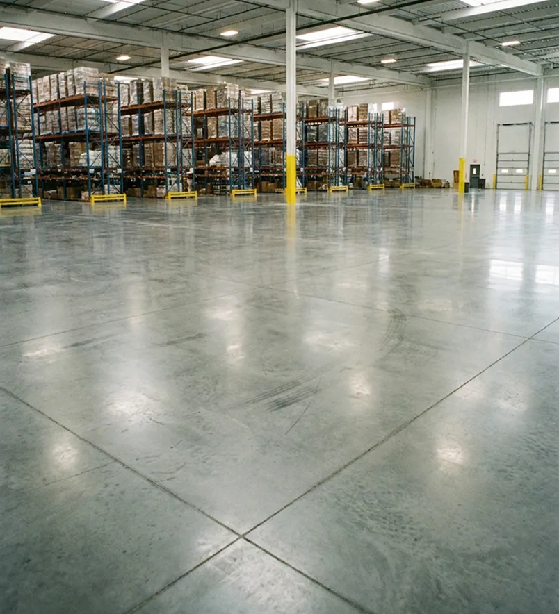 Бетонный топпинговый пол - выдерживает погрузчики и многолетнюю эксплуатацию. Пыль исчезает, уборка упрощается.