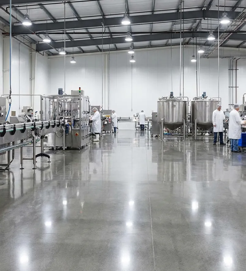 Полимерный пол, стойкий к маслам, химии и ударам. Соответствует санитарным нормам. Не скользит.